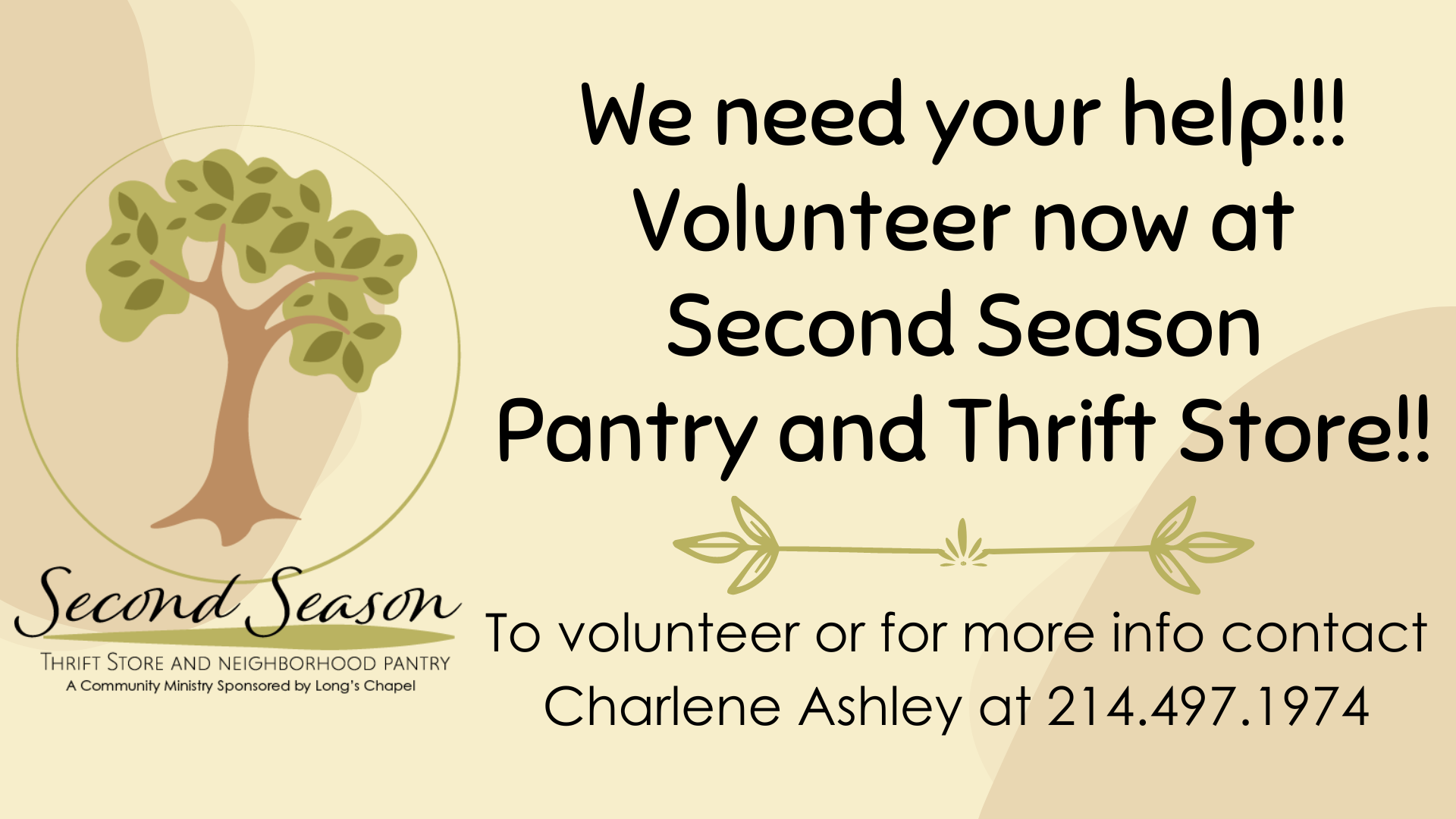 Second Season is the continuation of "The Open Door & Second Blessing Thrift Store" which was founded in 1996. We are beyond grateful for the selfless support of the community through the years. Our new location and change in format from prepared food to a pantry has been well received by those in need and allows our neighbors to select food for themselves and prepare it in their own homes. Again, your volunteer hours, donations, prayers,